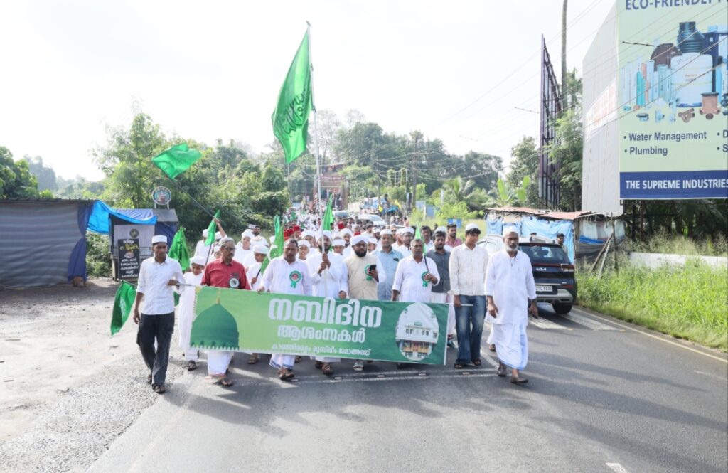 കാഞ്ഞിരമറ്റംമുസ്ലിം ജമാഅത്തിന്റെ ആഭിമുഖ്യത്തിൽ 5 9 2025 വെള്ളിയാഴ്ച പുലർച്ചെ 4. am. ന് പ്രഭാത മൗലിദോട് കൂടിആരംഭിച്ച പരിപാടി രാവിലെ8:00 മണിക്ക് കാഞ്ഞിരമറ്റം മുസ്ലിം ജമാഅത്തിന്റെ പ്രസിഡണ്ട് അബ്ദുൽസലാം ഇടവട്ടം പതാക ഉയർത്തി കാഞ്ഞിരമറ്റം പള്ളി ചീഫ് ഇമാം കല്ലൂർ സുബൈർ ബാഖവി ദുഅയും നബിദിന സന്ദേശവും നൽകി തുടർന്ന് 13 പ്രാദേശിക മഹല്ലുകളുടെ സംയുക്തമായി കാഞ്ഞിരമറ്റം മുസ്ലിം ജമാഅത്തിന്റെ ആഭിമുഖ്യത്തിൽ നബിദിന ഘോഷയാത്ര കാഞ്ഞിരമറ്റം പള്ളിയിൽ നിന്ന് പുറപ്പെട്ട് മിലുങ്കൽ ജംഗ്ഷനിൽ എത്തി തിരിച്ചു പള്ളിയിൽ എത്തിമൗലിദ് മജ്ലിസോട് കൂടി പരിപാടികൾ സമാപിച്ചു കാഞ്ഞിരമറ്റം മുസ്ലിം ജമാഅത്ത്എക്സിക്യൂട്ടീവ് അംഗങ്ങൾ കാഞ്ഞിരമറ്റം പള്ളി സ്റ്റാൻഡിങ് കമ്മിറ്റി മെമ്പർമാർപ്രാദേശിക മഹൽ ഇമാമുമാർ പ്രാദേശിക മഹൽ ഭാരവാഹികൾ മുതഅല്ലിമീങ്ങൾ മദ്രസ വിദ്യാർത്ഥികൾ മഹൽ അംഗങ്ങൾ തുടങ്ങിയവർ പങ്കെടുത്തു