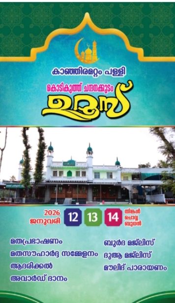 ചരിത്രപ്രസിദ്ധമായ കാഞ്ഞിരമറ്റം പള്ളി ചന്ദനക്കുടം ഉറൂസ് ജനുവരി ജനുവരി ’12, 13, 14 തിയതികളിൽ നടക്കും 12 ന് വൈകിട്ട് 7:00 മണിക്ക് മത പ്രഭാഷണ സദസ്സ്പള്ളി മാനേജർ അഡ്വക്കേറ്റ് അബ്ദുൽ ഷുക്കൂർ ഉദ്ഘാടനം ചെയ്യും ഷംസുദ്ദീൻ വഹബി പോഞ്ഞാശ്ശേരി മതപ്രഭാഷണം നടത്തുംകാഞ്ഞിരമറ്റം പള്ളി ചീഫ് ഇമാംകല്ലൂർ സുബൈർ ബാഖവിയുടെ ദുആയോടുകൂടി ആരംഭിക്കും തുടർന്ന് ബുർദ മജ്‌ലിസ്13ന് വൈകീട്ട് 7ന് മതസൗഹാർദ്ദ സമ്മേളനം പ്രതിപക്ഷ നേതാവ് വി.ഡി.സതീശൻ ഉദ്ഘാടനം ചെയ്യും, മാനേജർ അബ്ദുൾ ഷുക്കൂർ അധ്യക്ഷത വഹിക്കുന്ന യോഗത്തിൽ കല്ലൂർ സുബയർ ബാഖവി, ബിഷപ്പ് ഡോ.മാത്യൂസ് മോർ അന്തിമോസ്, ധർമ്മചൈതന്യ സ്വാമികൾ, കെ.പി.മുഹമ്മദ് തൗഫീക്ക് മൗലവി അൽ ബദരി അൽ ബാഖവി, അഡ്വ.ഫ്രാൻസീസ് ജോർജ് എം.പി, അനൂപ് ജേക്കബ് എം.എൽ.എ.അഡ്വ.കെ.എൻ.സുഗതൻ മുഹമ്മദ് ഇക്ബാൽ, ഗ്രാമ പഞ്ചായത്ത് പ്രസിഡണ്ട് കെ.ജി.രഞ്ജിത്ത്, എടക്കാട്ടുവയൽ ഗ്രാമ പഞ്ചായത്ത് വൈസ് പ്രസിഡണ്ട് കെ.ആർ.ജയകുമാർ, കാഞ്ഞിരമറ്റം മുസ്ലിം ജമാഅത്തിന്റെ പ്രസിഡണ്ട് അബ്ദുൽസലാം ഇടവട്ടംസ്റ്റാൻഡിങ് കമ്മിറ്റി മെമ്പർമാരായ അജ്മൽ വാലുമ്മൽഅസീസ് കൊച്ച് കിഴക്കേതിൽ സൂപ്പി കളത്തിപ്പടിആഘോഷ കമ്മിറ്റി കൺവീനർ െകരീം കിഴക്കേടത്ത് മേലിൽജോയിൻ കൺവീനർ റഫീഖ് മൂഴിയിൽഴിയിൽ,  വാ ർഡ് മെമ്പർമാരായ സലിം അലി, എം.എസ്സ്.ഹമീദ് കുട്ടി എന്നിവർ സംസാരിക്കും തുടർന്ന് ബുർദ മജ്ലിസ് ,ദു ആ സമ്മേളനം ജനുവരി 14 ന് രാവിലെ 10ന് കലുപറമ്പിൽ നിന്നും, ചുണ്ടക്കാട്ട് നിന്നും കൊടിഘോഷയാത്ര രാവിലെ 10.30 ന് താഴത്തെ പള്ളിയിലും 11 മണിക്ക് മലേപ്പള്ളിയിലും കൊടികയറ്റൽ രാത്രി ചന്ദനക്കുടം എന്നിവയോടെ സമാപനം.