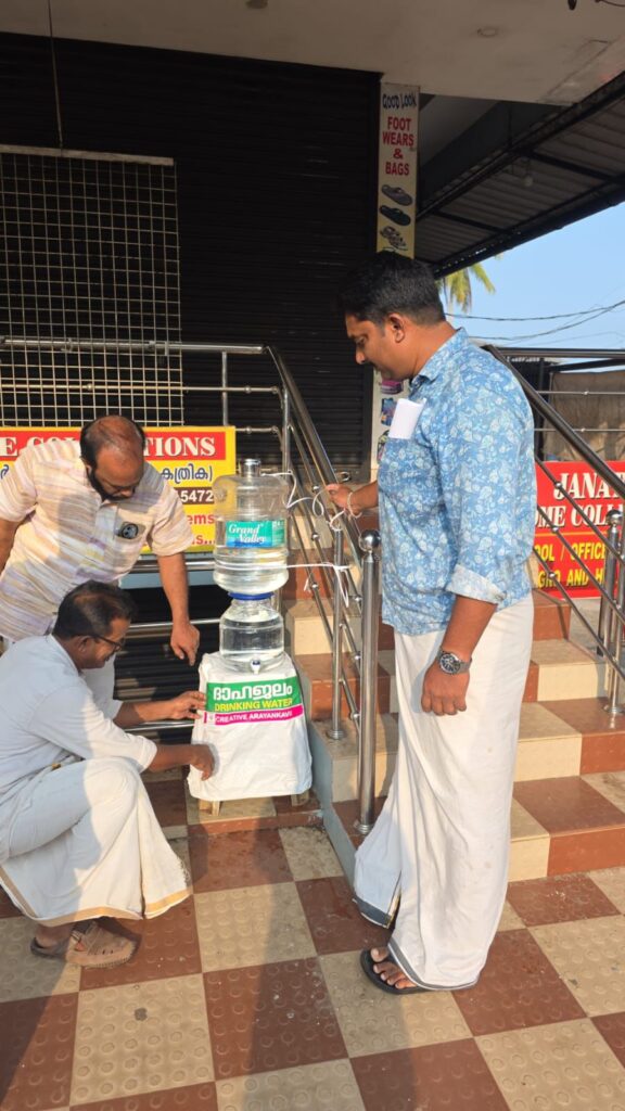 അരയൻകാവ്: വേനൽചൂട് അതികഠിനമായി തുടരുന്ന സാഹചര്യത്തിൽ പൊതുജനങ്ങൾക്ക് ആശ്വാസമേകാൻ ദാഹജല വിതരണവുമായി ‘ക്രിയേറ്റീവ് അരയൻകാവ്’. ആമ്പല്ലൂർ ഗ്രാമപഞ്ചായത്തിന്റെ പ്രത്യേക അഭ്യർത്ഥന പ്രകാരമാണ് അരയൻകാവിലെ രണ്ട് പ്രധാന ബസ് സ്റ്റോപ്പുകളിൽ കുടിവെള്ള വിതരണം ആരംഭിച്ചത്.