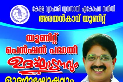 കേരള വ്യാപാരി വ്യവസായി ഏകോപന സമിതി അരയൻകാവ് യൂണിറ്റിന്റെ പെൻഷൻ പദ്ധതി ഉദ്ഘാടനവും ഓണാഘോഷവും സംസ്ഥാന…